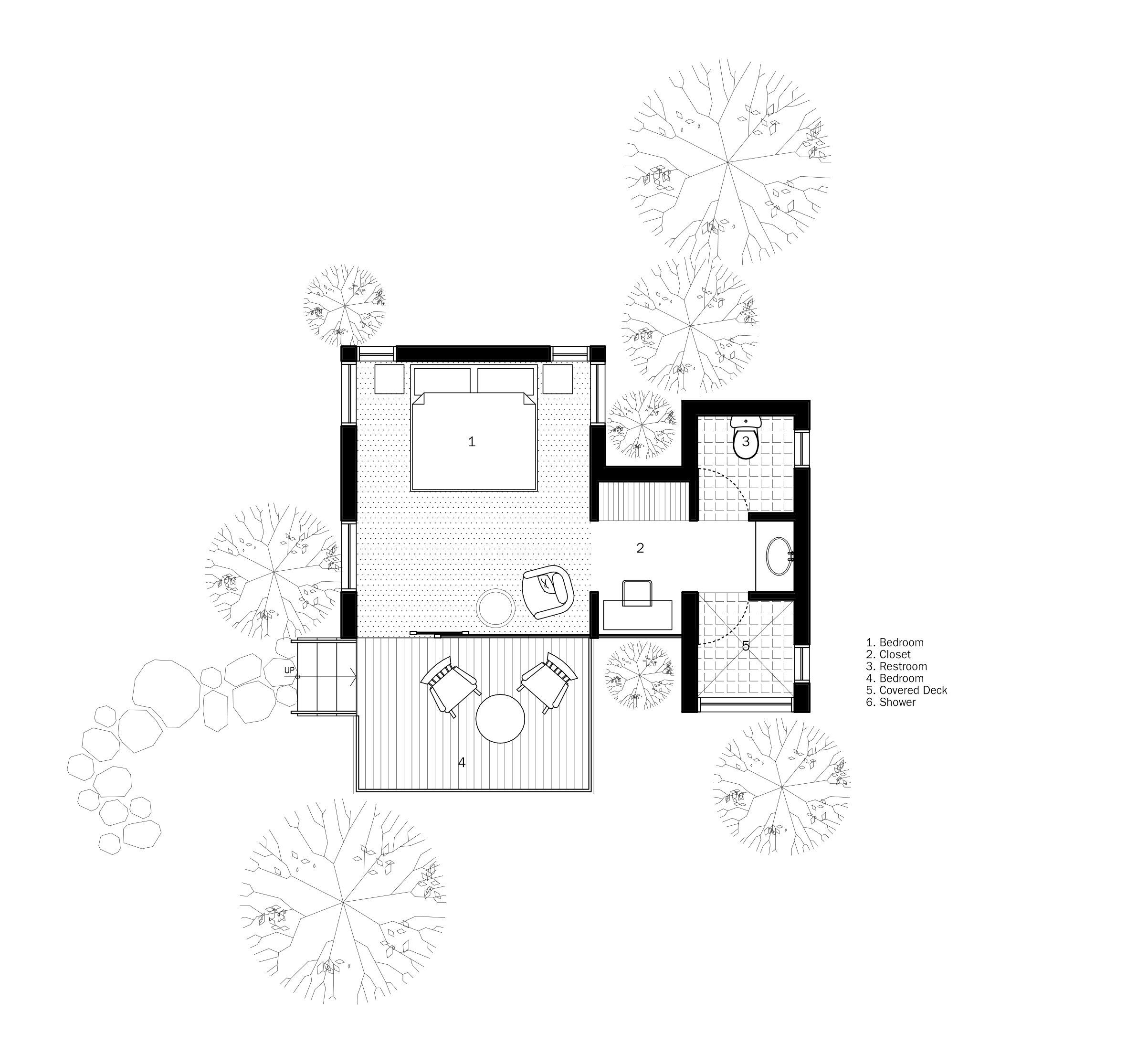 The buildings were made of the local laterite stone. The stone was native to the site and in large part came from the buildings foundations. Conceptualized as a series of constructed and natural rocks emerging from the hill side, collectively seen both natural landscape and built landscape emerged as an extension of the ground plane. Specifically, this was manifest through the high laterite plinths with punctures that were reminiscent in form and spirit of the near by fort (Sindudurgh translates to “Fort of the Sea”). The interior spaces of the buildings along with their private pools created an internal microclimate that protected one from an external weather system.