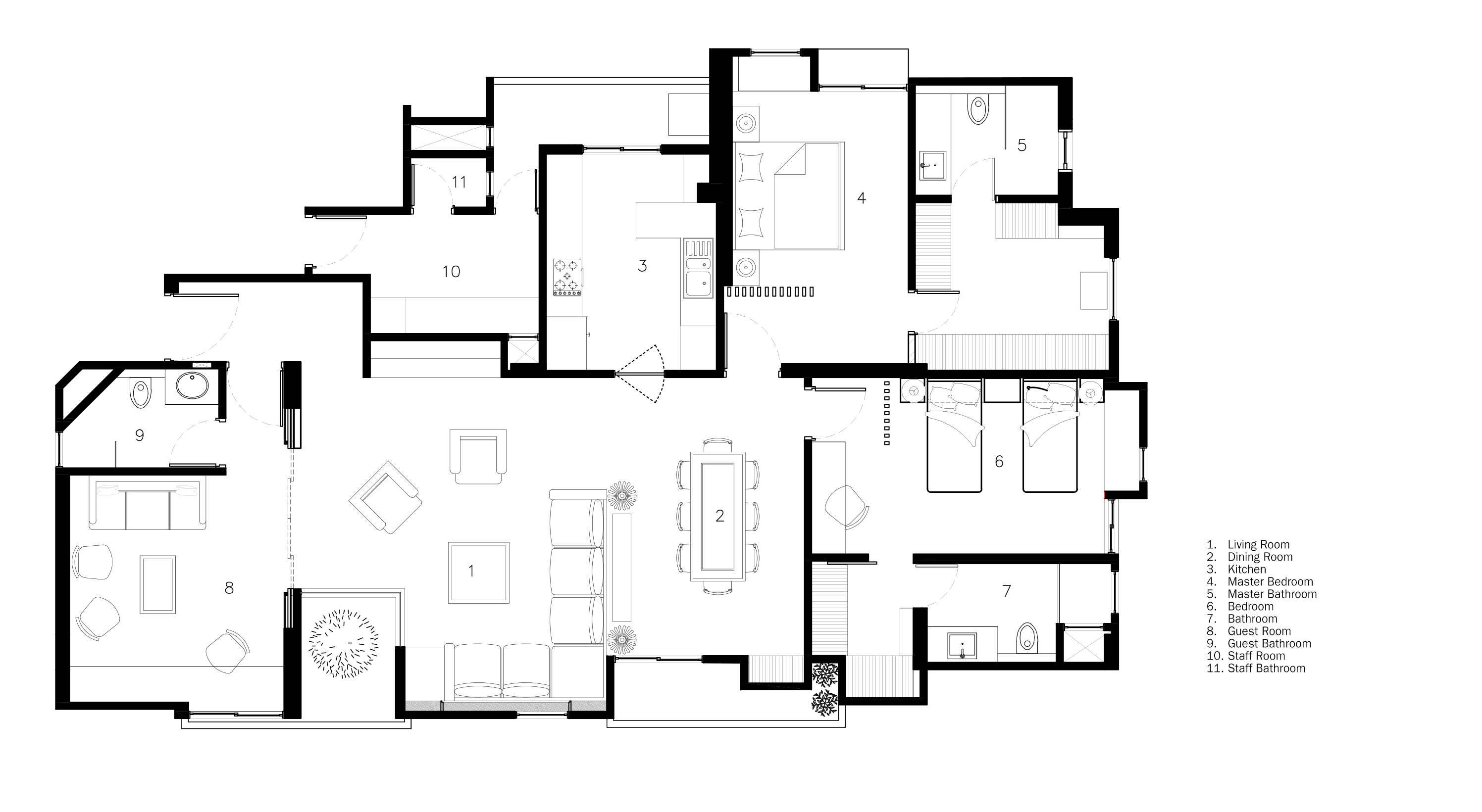 The next step was to carve out areas to create functional nooks: a concealed bar from the staff room, a dining room console unit from the balcony, a green landscape glass cubicle from dead circulation area and a balcony.